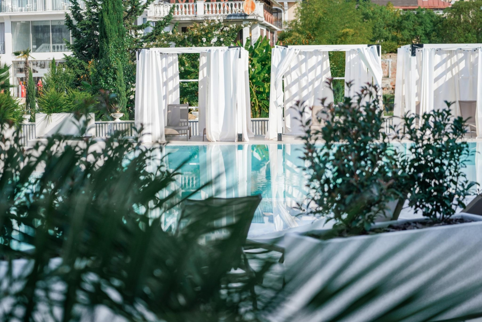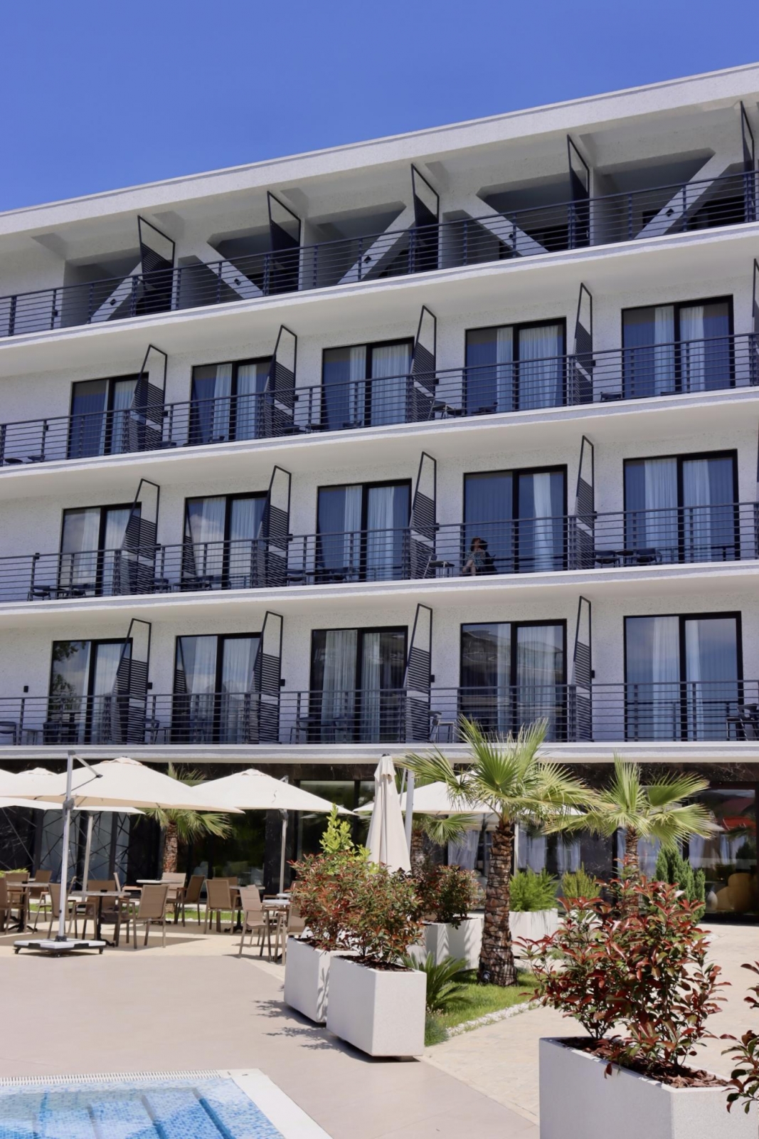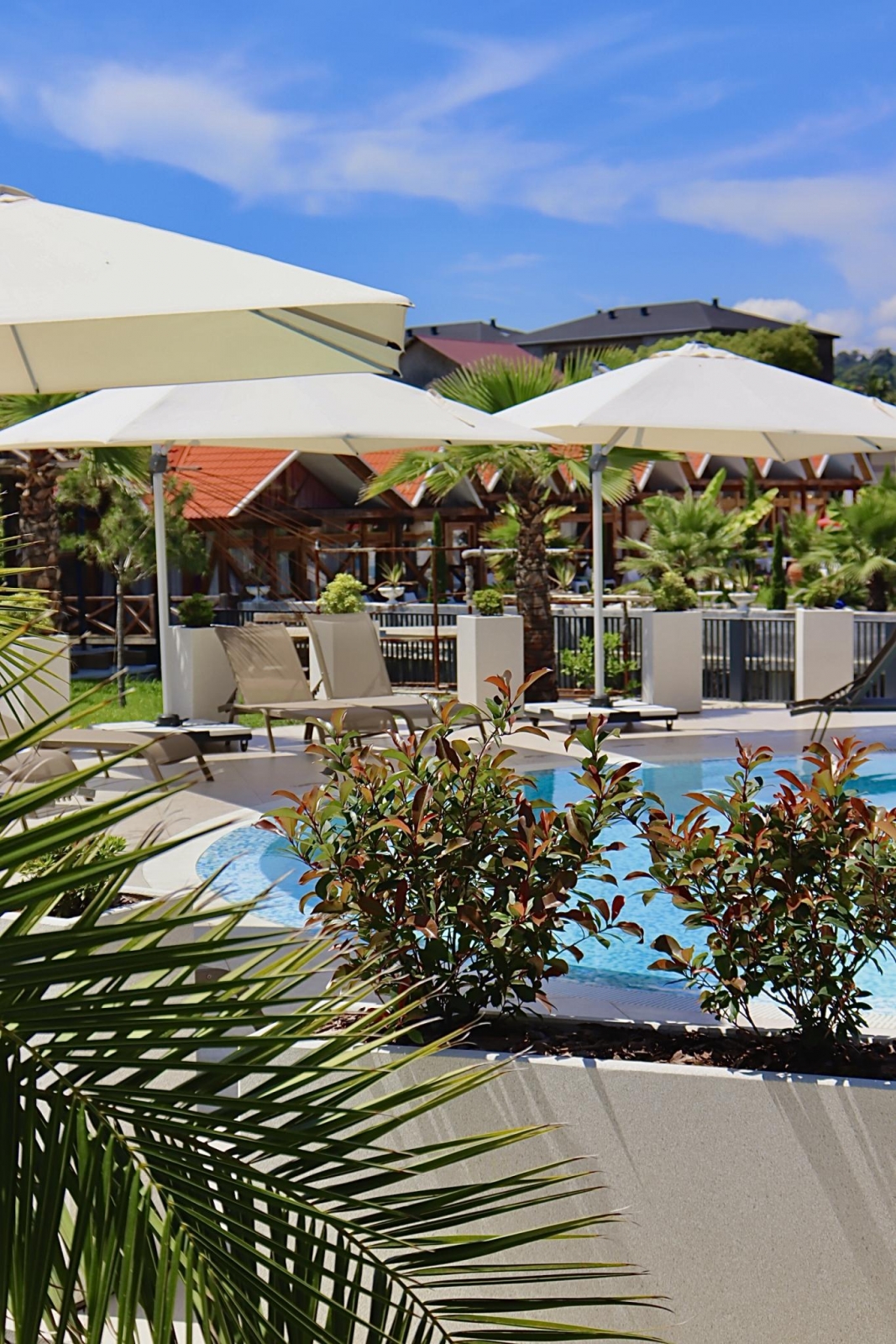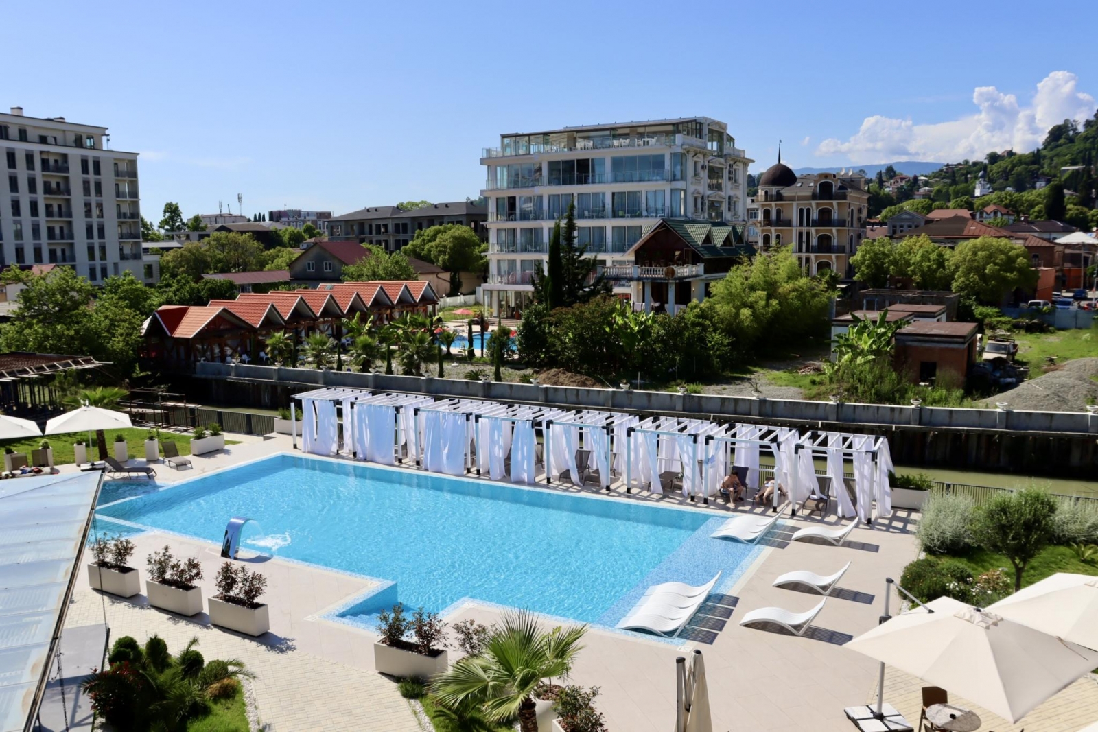 Территория, расположенная вокруг бассейнов, обустроена дорожками, выложенными современной брусчаткой и высаженными декоративными, хвойными растениями, а также великолепными южными пальмами. На всей территории отеля функционирует бесплатный Wi-Fi, у центрального входа в отель расположено бесплатное парковочное место. Отель располагает собственной службой охраны.
