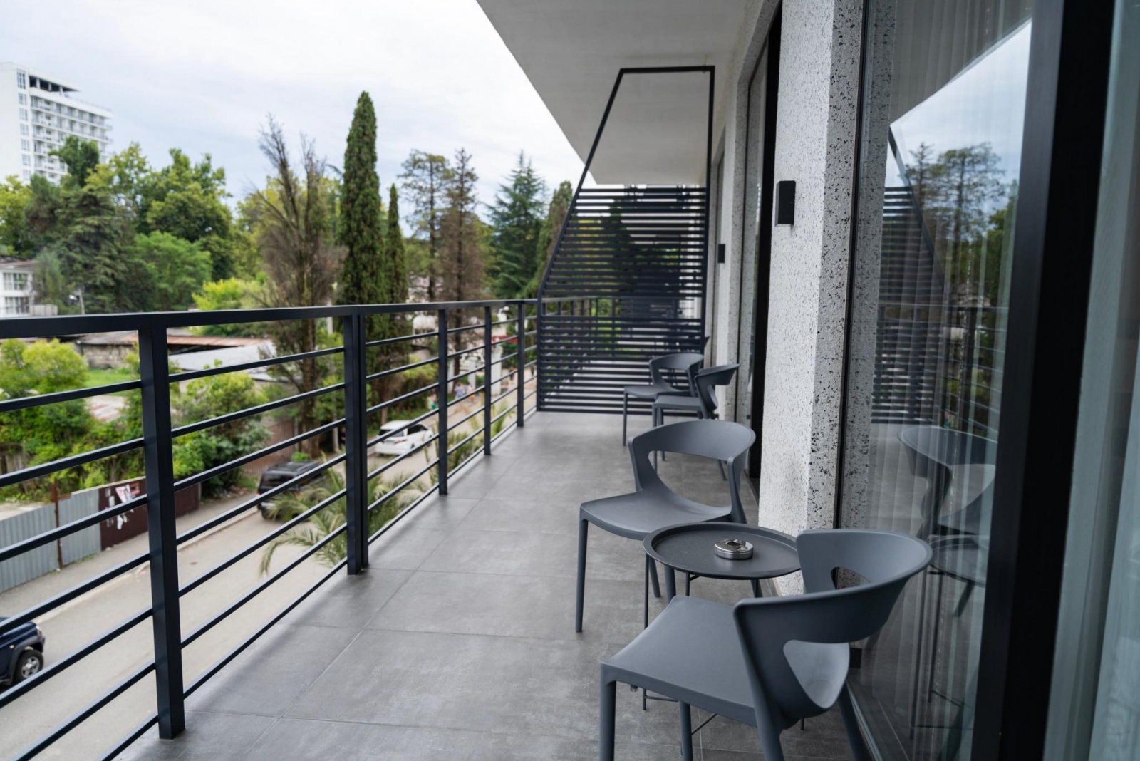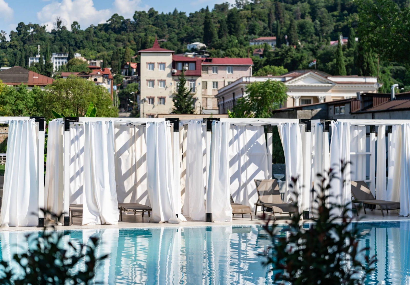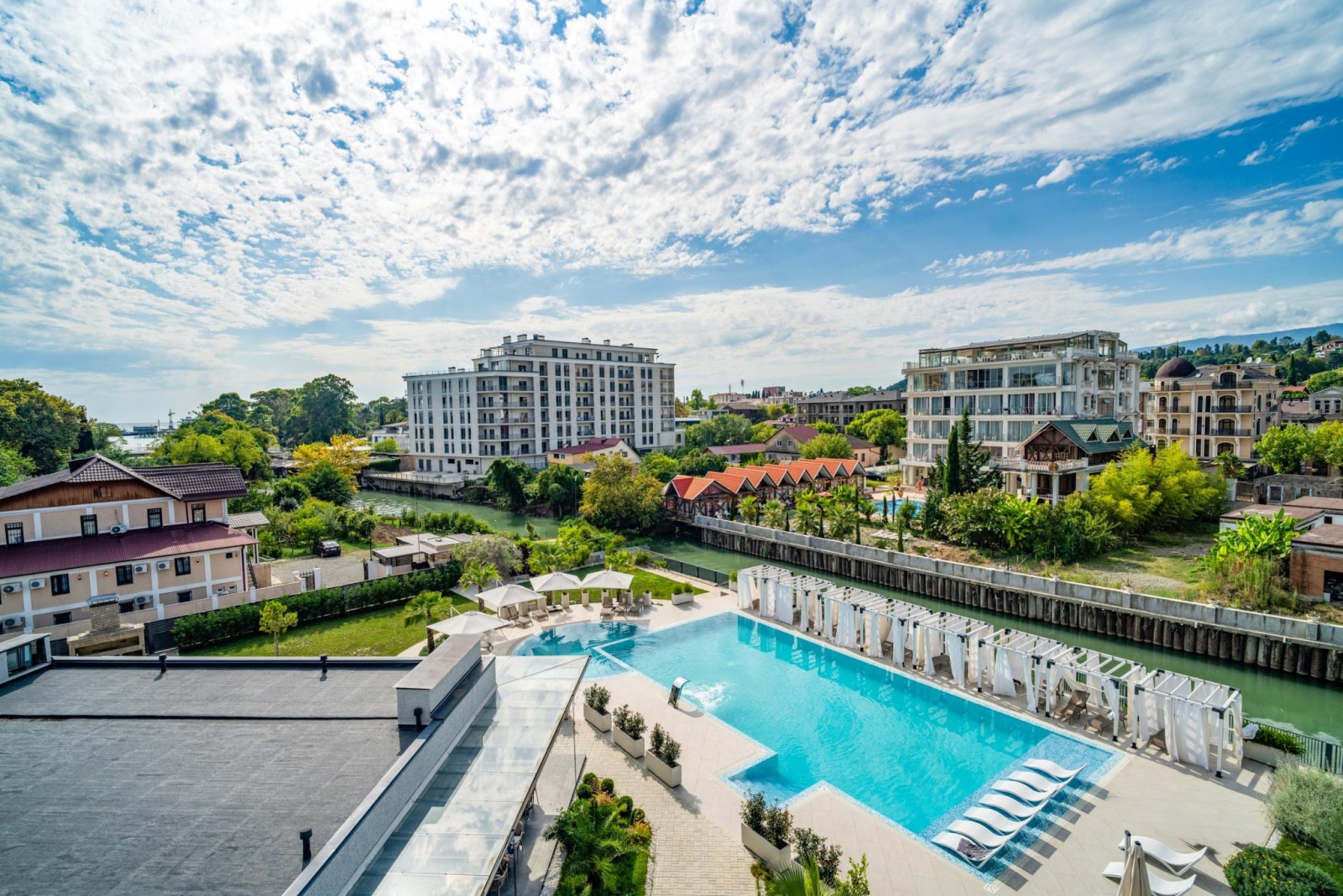 Расположение отеля таково, что с обеих его сторон открывается прекрасный вид на сухумскую гору с ее великолепной жилой застройкой конца 19 - начала 20 вв. С одной стороны отеля из номеров просматривается море с его волшебными закатами и загадочными рассветами, рыболовными суднами, стоящими на рейде, и белыми парусниками, скользящими по водной глади. С противоположной стороны отеля открывается возможность созерцать горные очертания с их южной субтропической флорой.